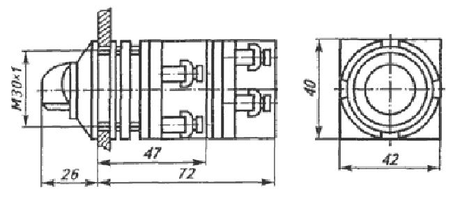 Переключатели состоят из управляющего устройства (привода), одного или двух унифицированных контактных блоков и деталей, обеспечивающих крепление и ориентацию аппарата на панели.